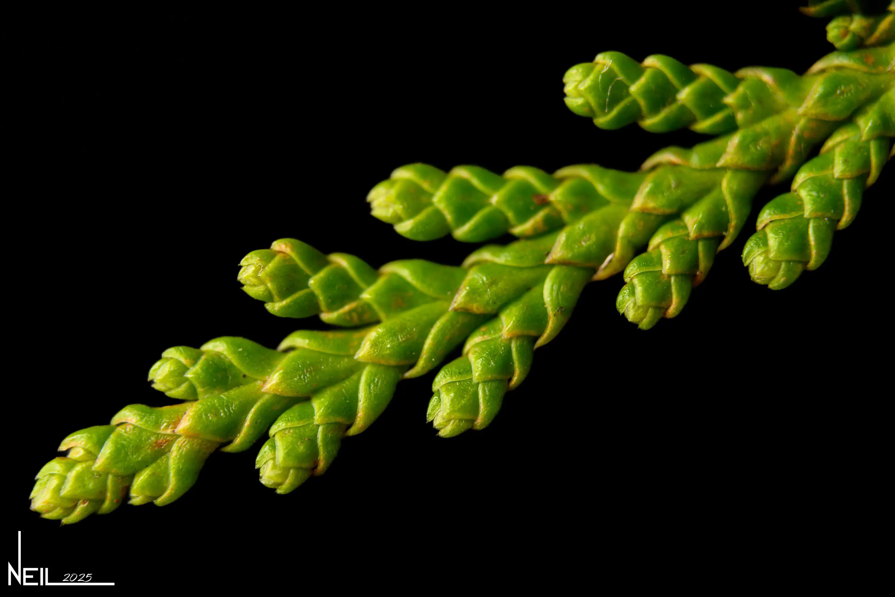 A macro shot of a coniferous branch, showcasing the intricate, fractal-like patterns of its needles against a stark black background.